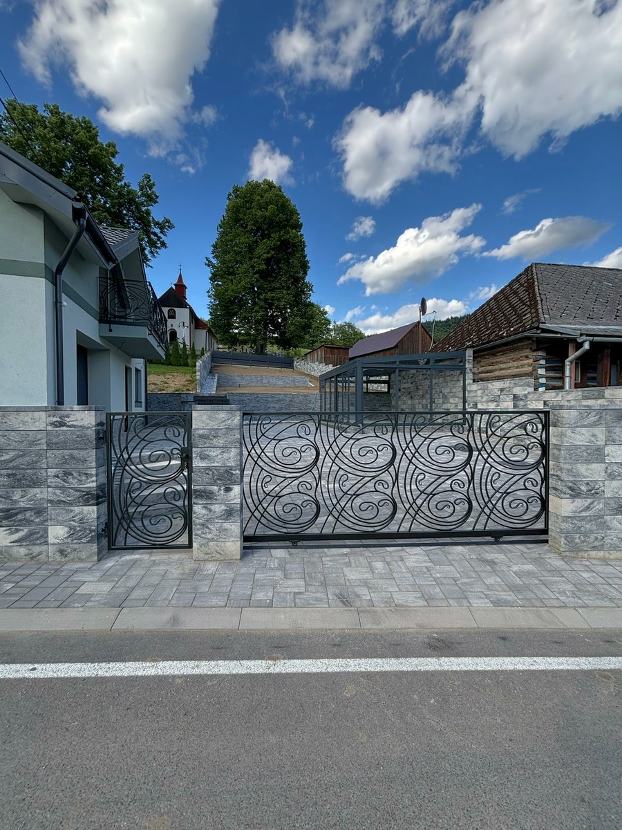 Majestátna kovaná brána s bránkou vyrobená pre rodinný dom pri Martine