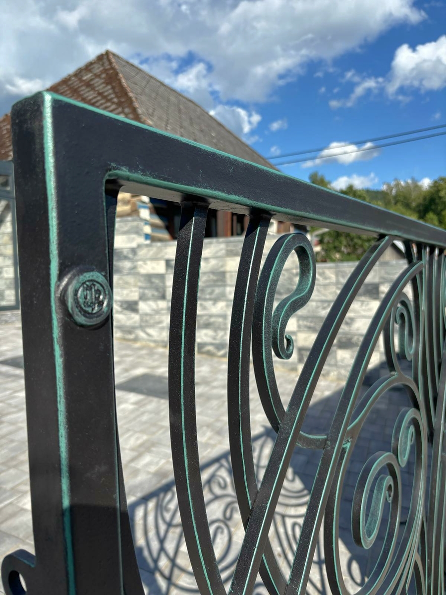 Kovaná brána s pečaťou UKOVMI v čiernej farbe a zelenej patine