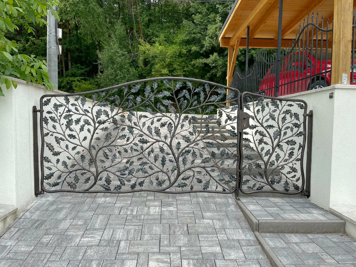 Luxusná ručne kovaná brána s dubovými konármi - oplotenie rodinného domu v dedinke pri Humennom