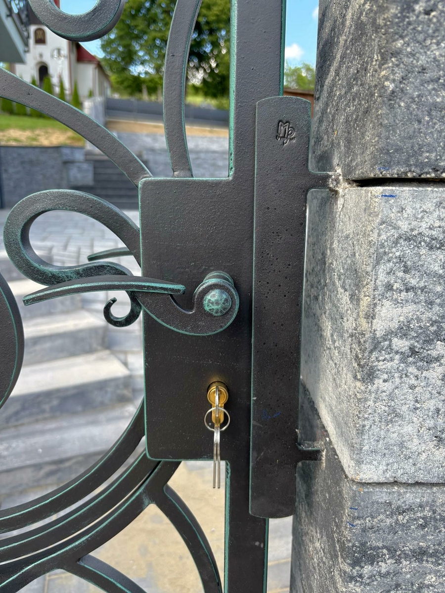 Kovaná brána s pečaťou UKOVMI v čiernej farbe a zelenej patine